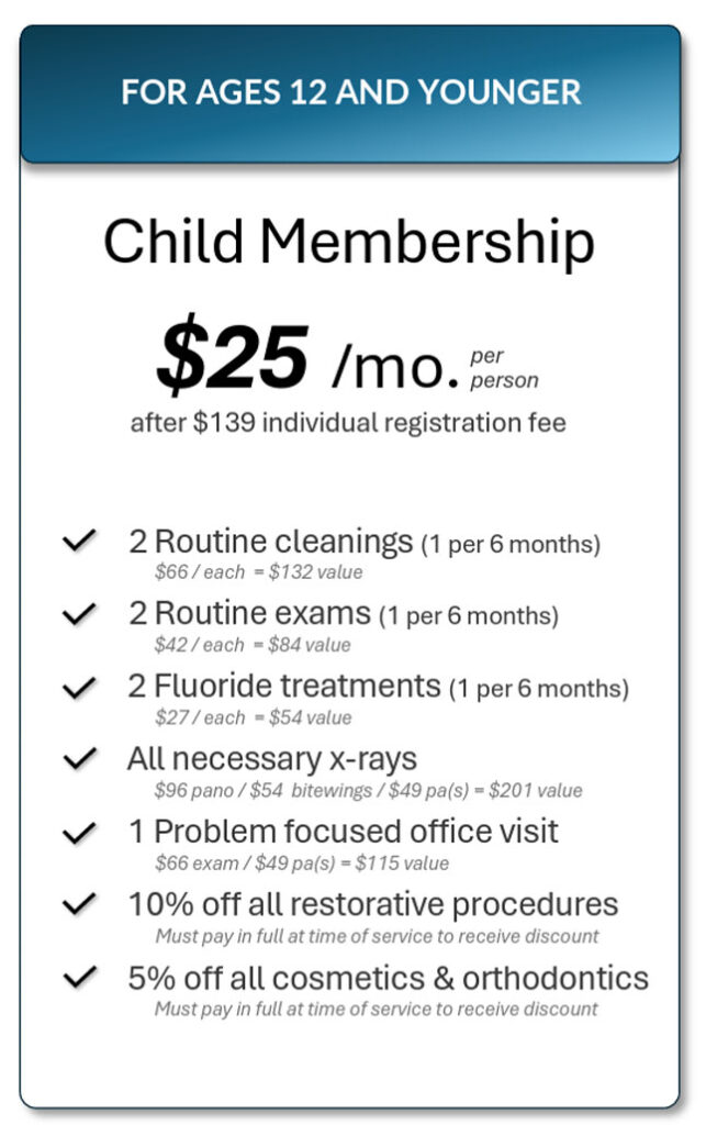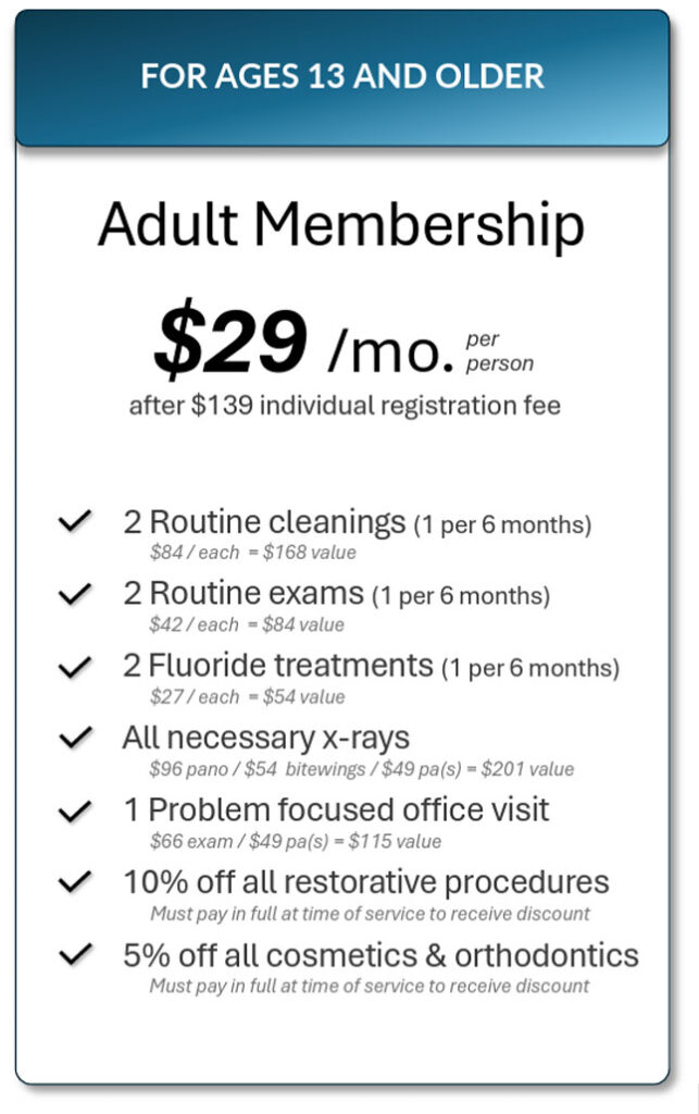 Appointment cancellation fees still apply. Membership Exclusion: Unfortunately, in the event of active periodontal disease, routine cleanings and exams cannot be performed until the necessary restorative perio procedures are completed. In this case, the 10% discount will be applied toward the prescribed periodontal procedures, and any membership plan fees will be credited to your account.